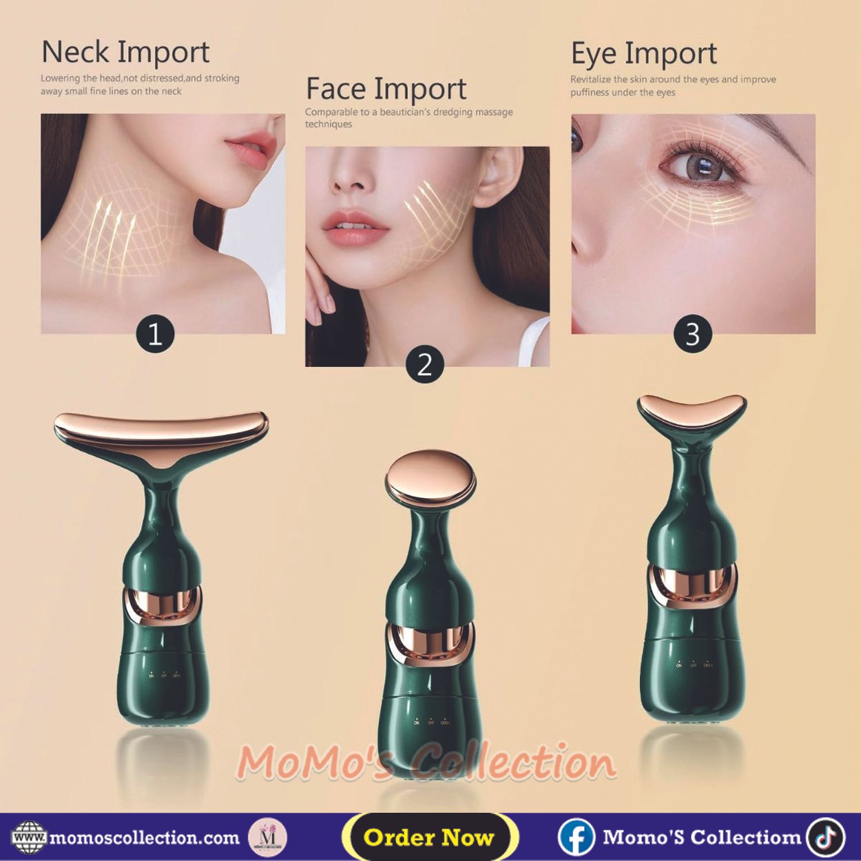 3️⃣ নিচ থেকে উপরের দিকে হালকা প্রেসারে ফেস ও নেকে ব্যবহার করুন।